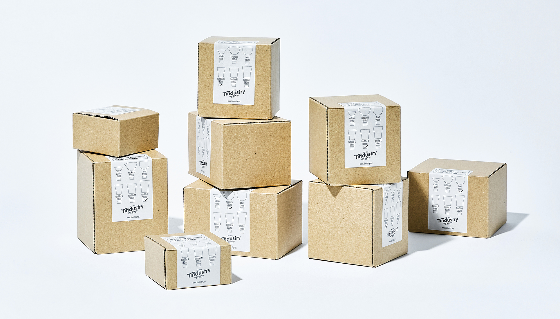 既存の段ボール箱にサイズ一覧が入ったシールだけの簡素な作りで